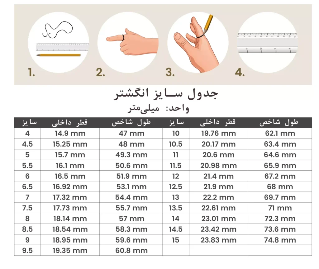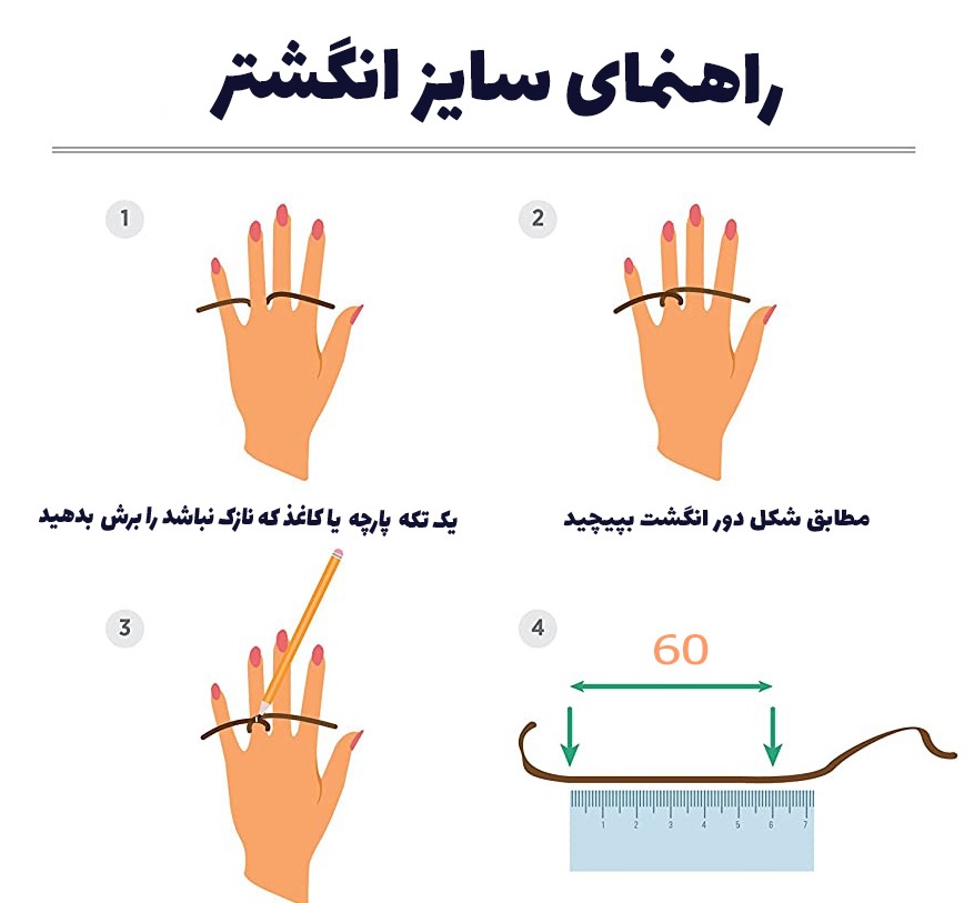 نکته مهم این است که سایز انگشت ممکن است در تابستان و زمستان کمی تغییر کند، بنابراین همیشه یک سایز راحت و استاندارد انتخاب کنید.